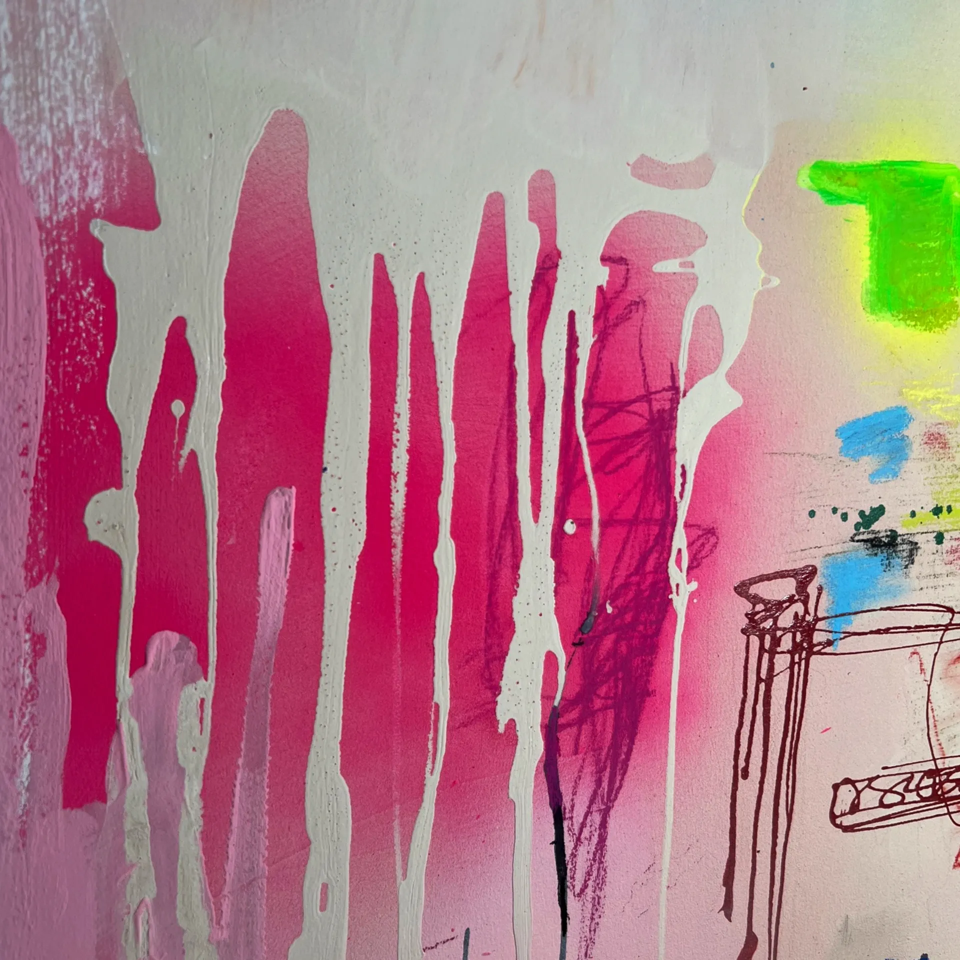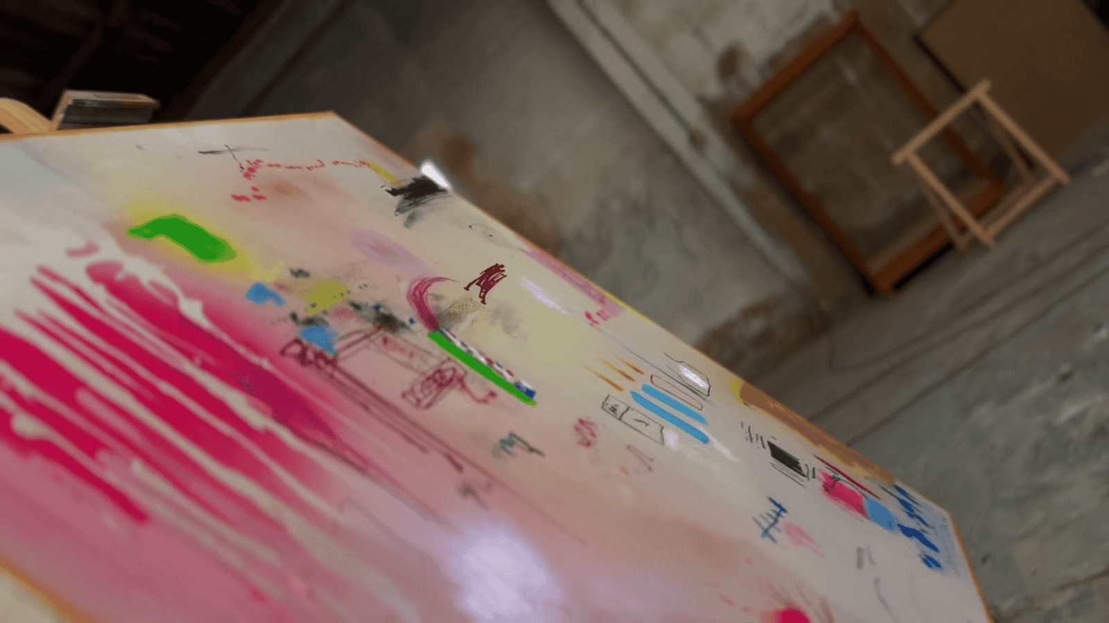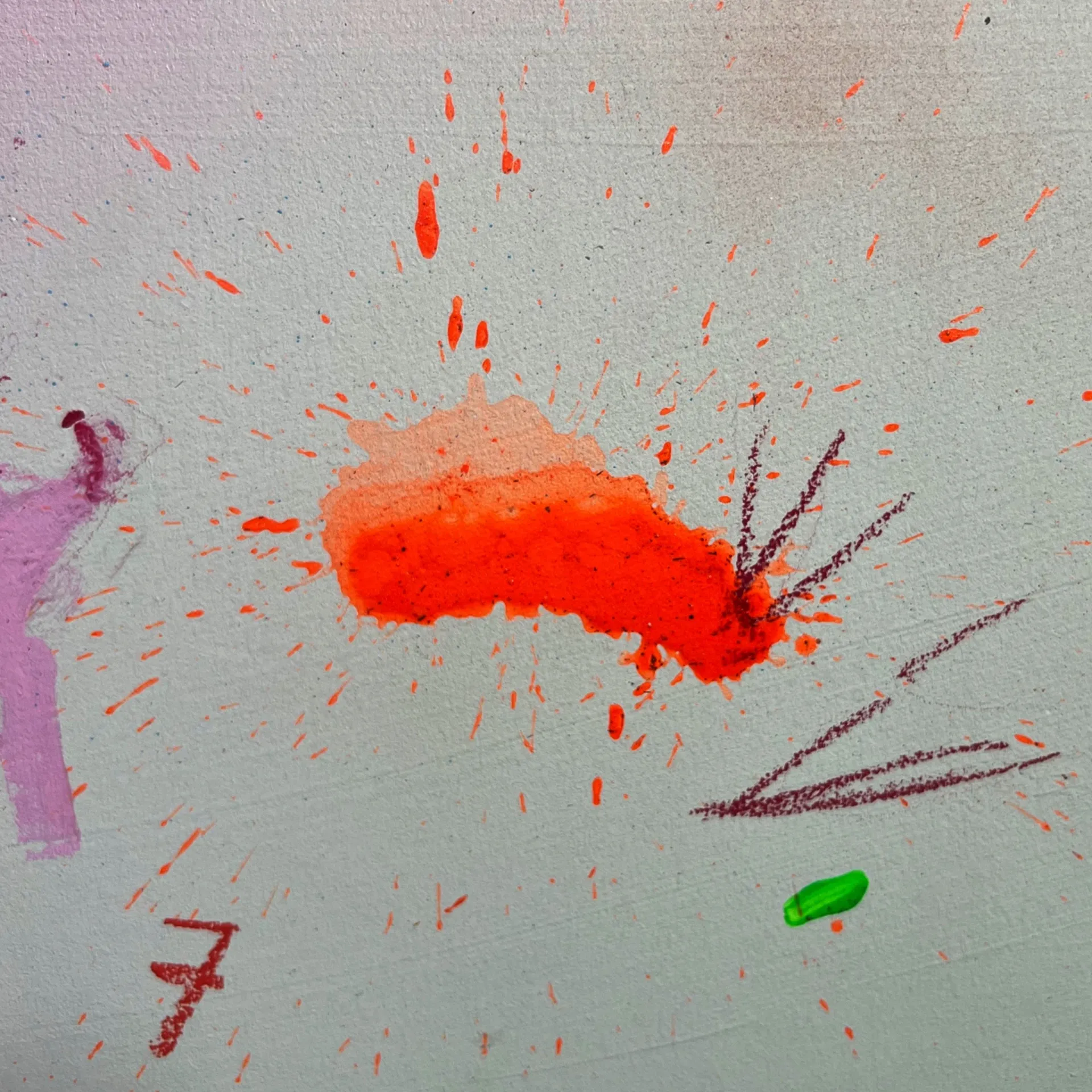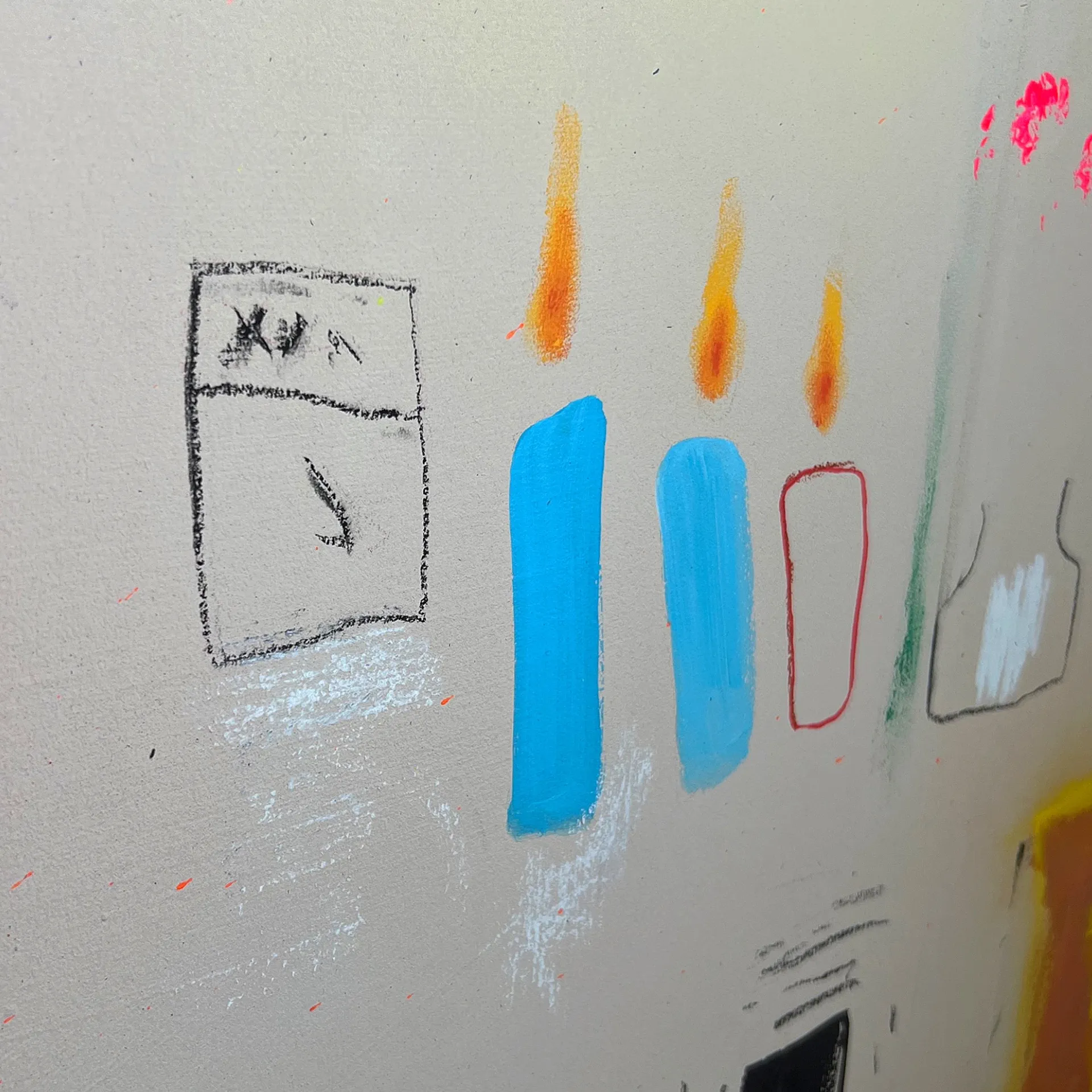 Loose strokes, fragmented symbols and layered pigments create a visual rhythm that suggests time stretching, looping or escaping.