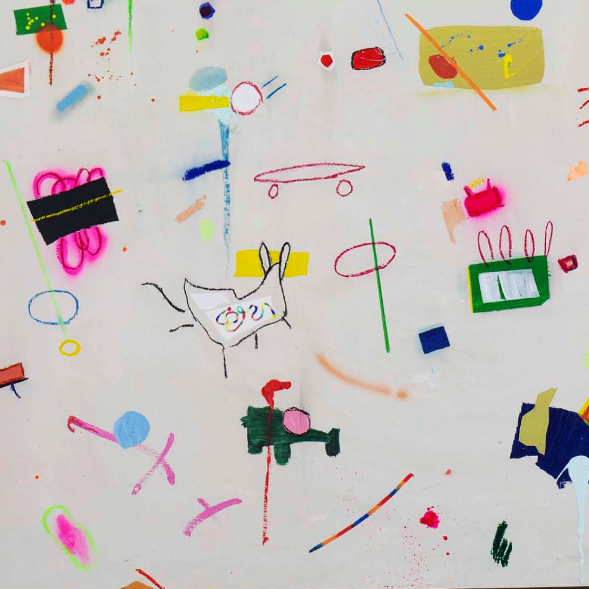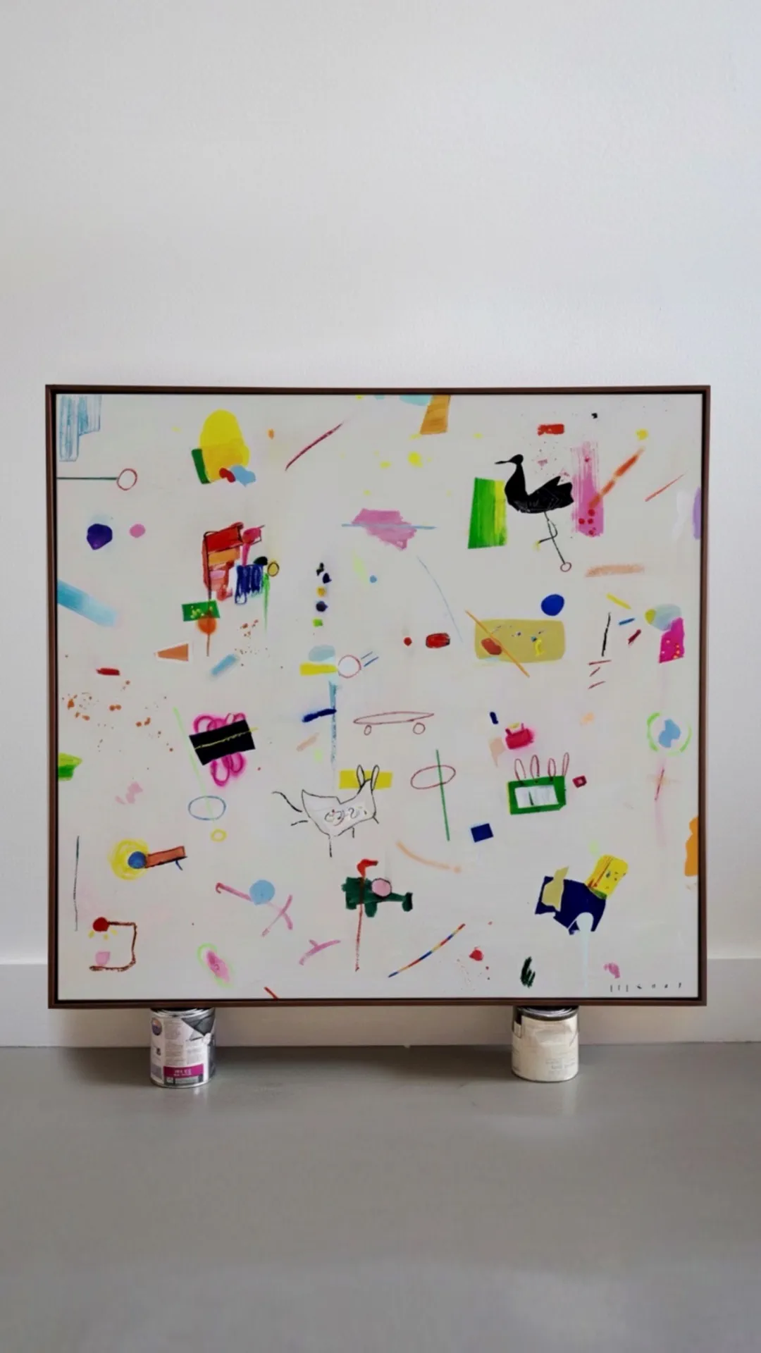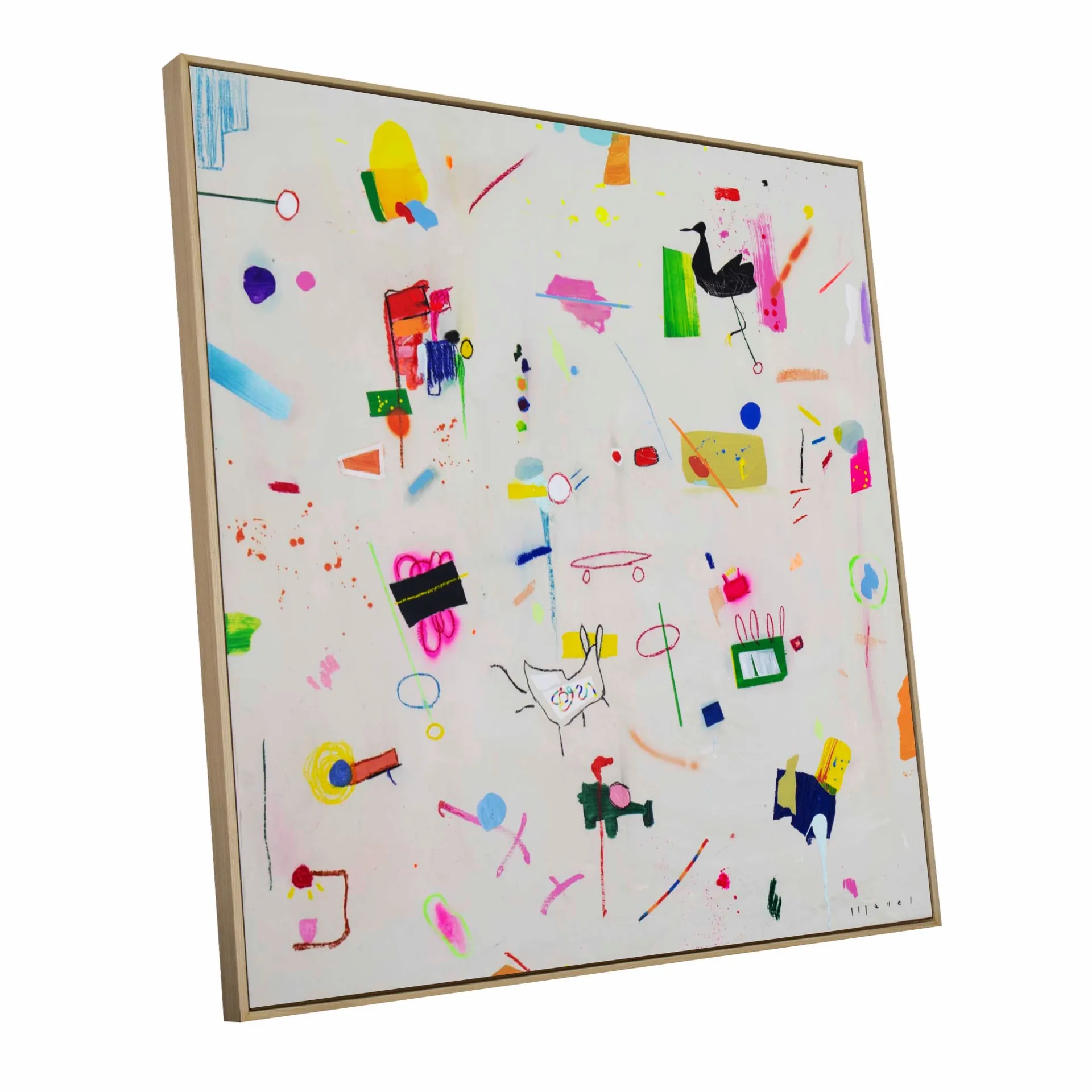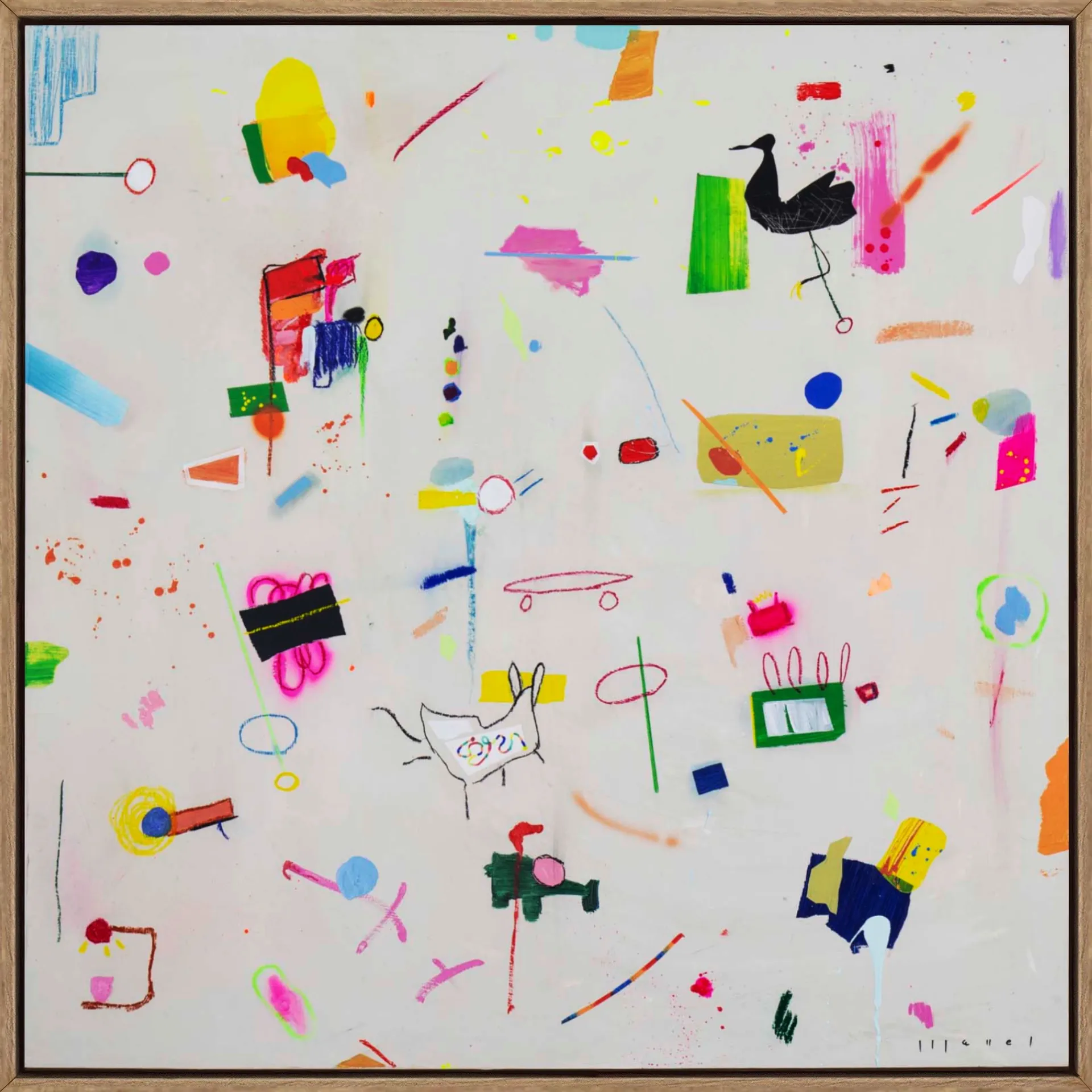 Each artwork embraces a sense of expressive looseness. Characters may chase, collide, float or simply coexist, creating a lively rhythm across the canvas. Nothing is overly planned: meaning appears through curiosity, interaction and spontaneity—much like how games unfold in childhood. The result is a vibrant and joyful universe where abstraction and imagination meet, inviting viewers to interpret, invent and play.