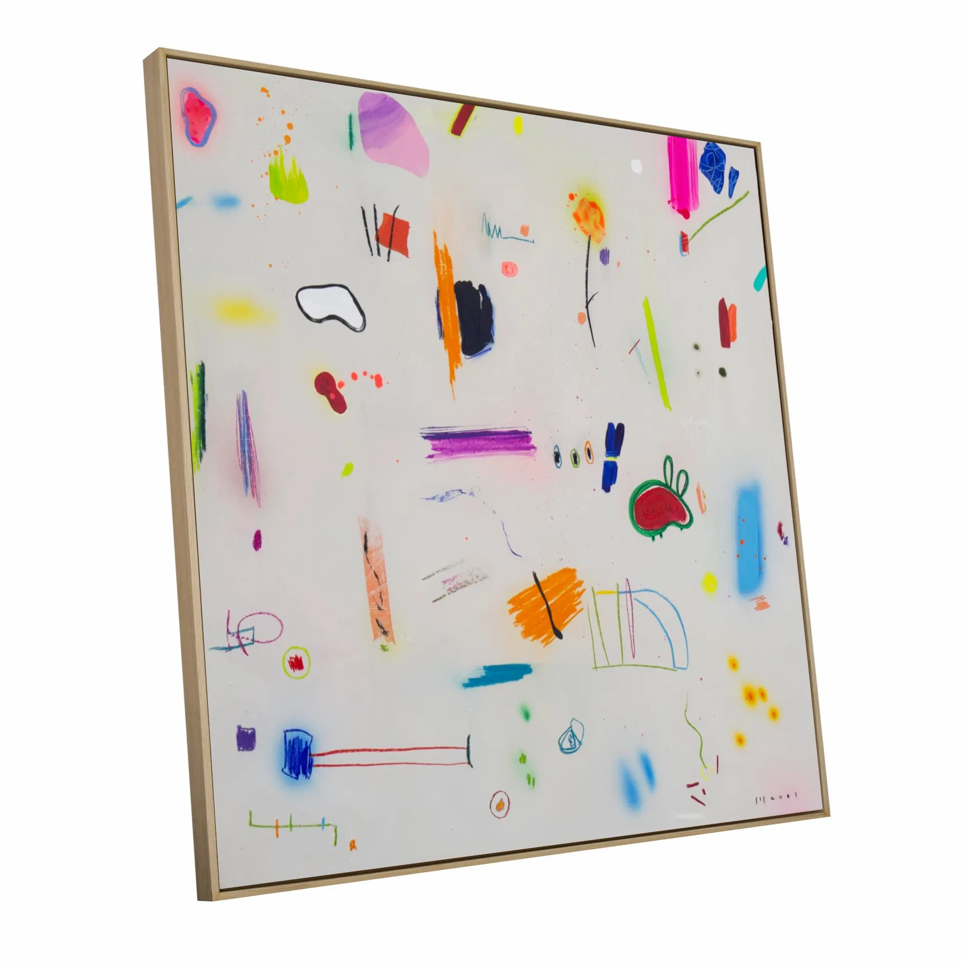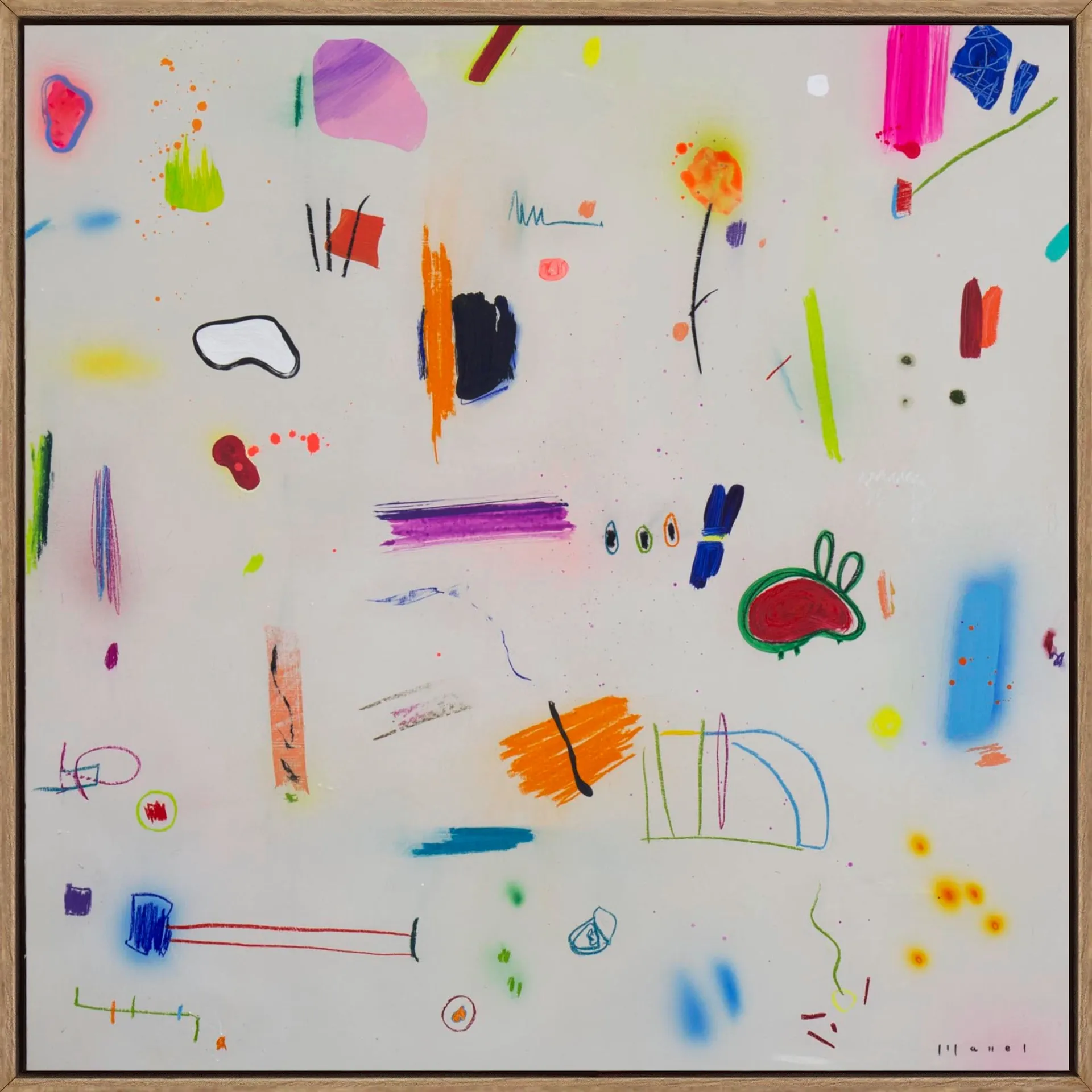 Each artwork embraces a sense of expressive looseness. Characters may chase, collide, float or simply coexist, creating a lively rhythm across the canvas. Nothing is overly planned: meaning appears through curiosity, interaction and spontaneity—much like how games unfold in childhood. The result is a vibrant and joyful universe where abstraction and imagination meet, inviting viewers to interpret, invent and play.
