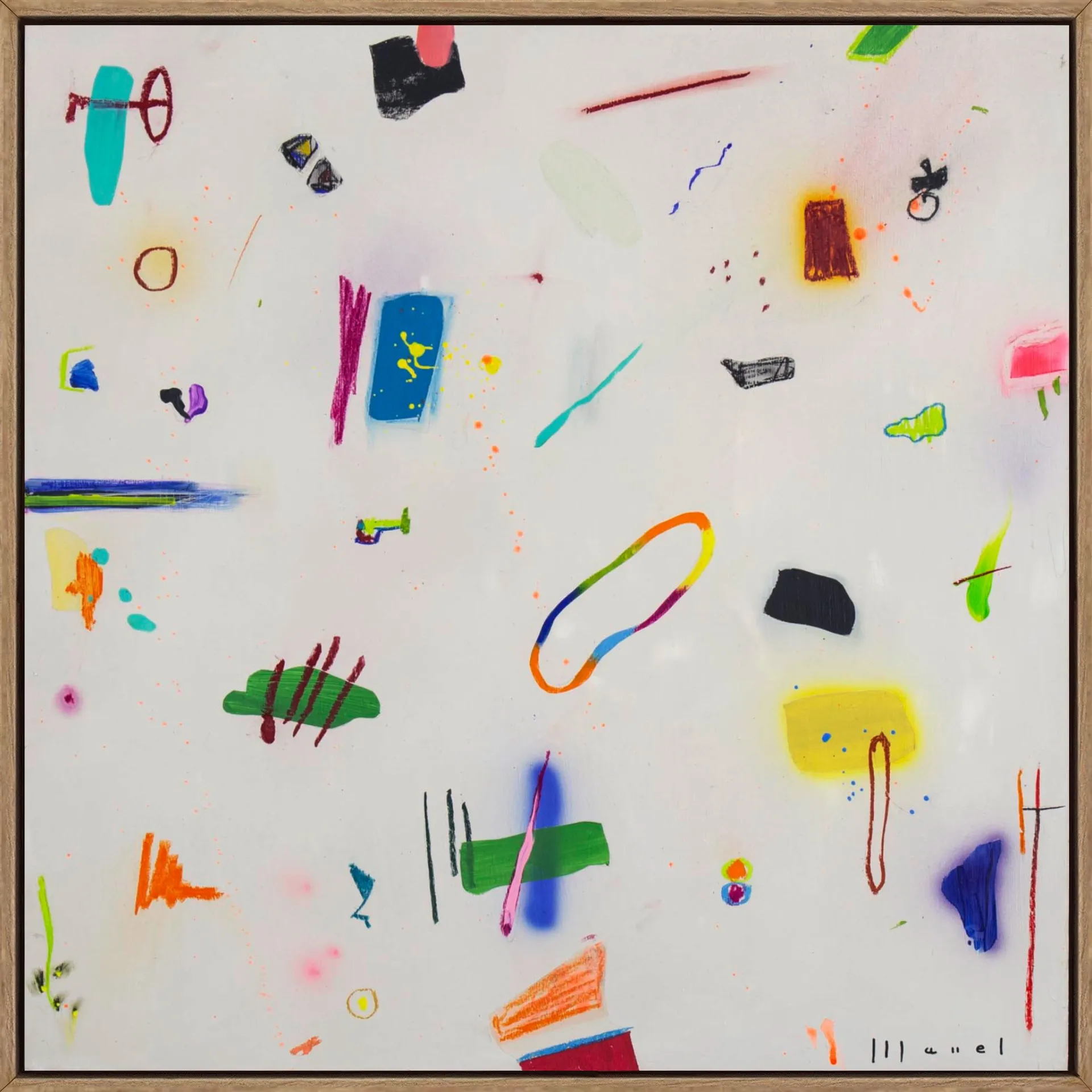 Playtime is the most playful and spontaneous of Manel’s collections. Instead of suggesting quiet narratives or symbolic fables, these works burst into life through small figures, shapes and gestures that interact with one another like characters in an improvised story. The surface becomes a playground where humour, surprise and movement coexist, leaving space for the viewer to discover relationships, tensions or jokes hidden within the composition.