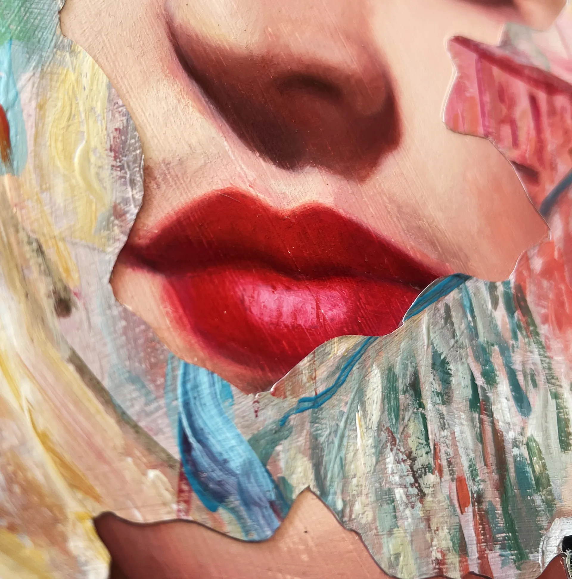On top of the oil portrait, ALCAM paints a second version in acrylic. This layer draws inspiration from neo-expressionism, allowing the artist to break, disrupt and emotionally reinterpret the figure through gestural brushwork, symbolic marks and expressive rhythms.
